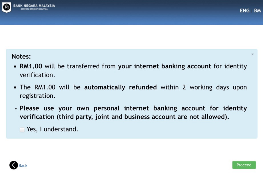 Seterusnya RM1.00 akan dikenakan bayaran untuk proses verifikasi. Dan akan dipulangkan dalam masa dua hari. Sila gunakan akaun individu, dan tidak boleh guna akaun pihak ketiga.